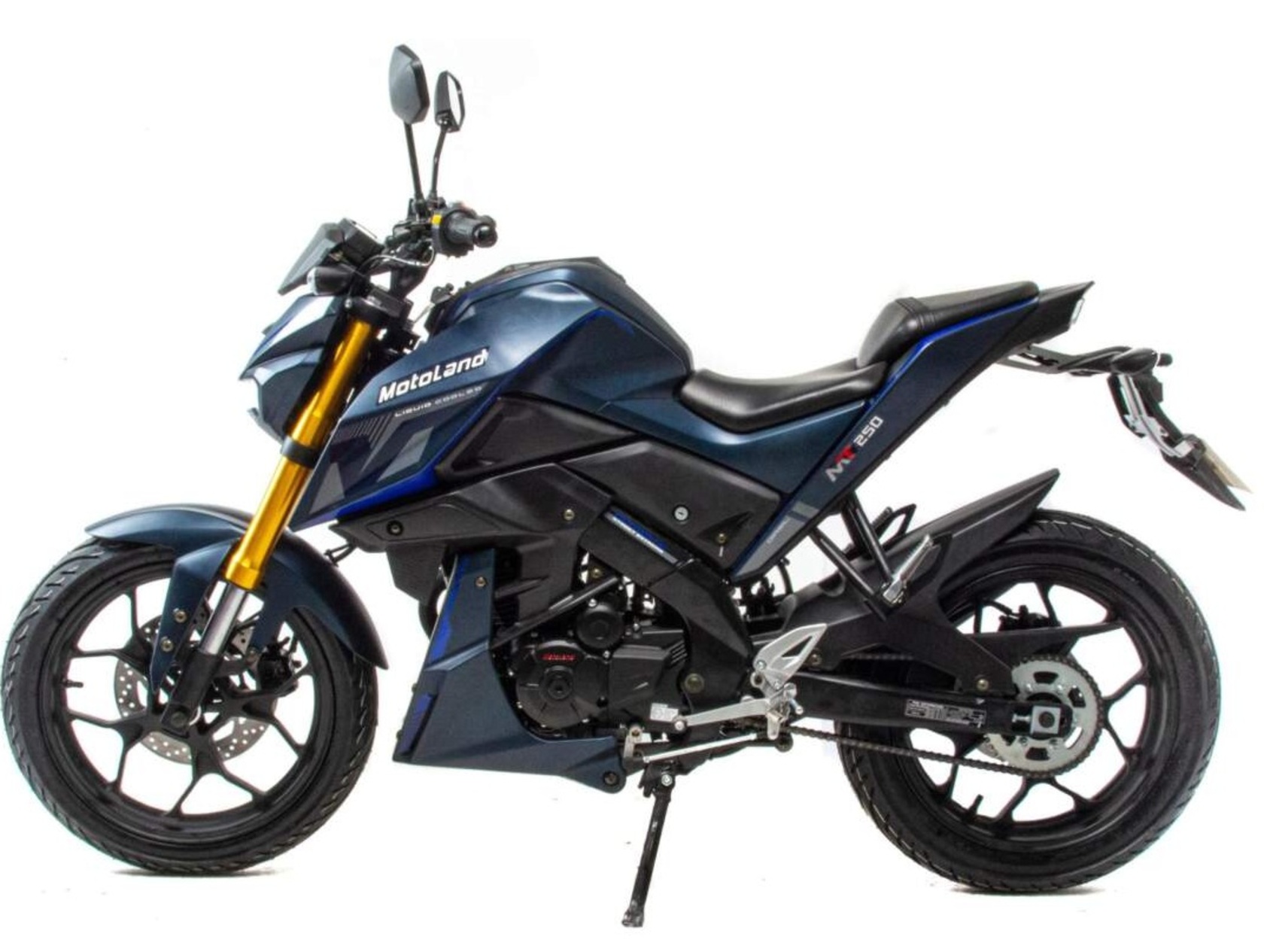 MOTOLAND MT 250- Новинка 2022 годаПредставляем Вашему вниманию дорожный мотоцикл на пятискоростном двигателе 172 FMM-5 (PR250 с балансиром) , с масляным и воздушным радиаторами, кикстартером и электростартером, мощностью 21 л.с. На двигателе установлен карбюратор Keihin PZ 30.Также на новинке установлены двухпоршневые передние тормоза, литые алюминиевые обода , передняя вилка перевёрнутого типа с большим ходом, которая обеспечивает отличную управляемость для комфортного передвижения, как по городу, так и по бездорожью.Современный дизайн мотоцикла MOTOLAND MT 250 разработан с учетом всех последних новшеств.428 цепь в сочетании с хорошо подобранными звездами, обеспечивает отличную динамику.Хорошо подобранные покрышки на 17" ободах, 110/70 и 130/70, обеспечивают отличное сцепление с дорожным покрытием.Рама дуплексная, профилированная, усиленная ребрами жесткости. Удобное кожаное сиденье и жидкокристаллическая панель приборов с подсветкой - заставят радоваться комфорту и удобству.Световое оборудование на экономичных и долговечных светодиодах.