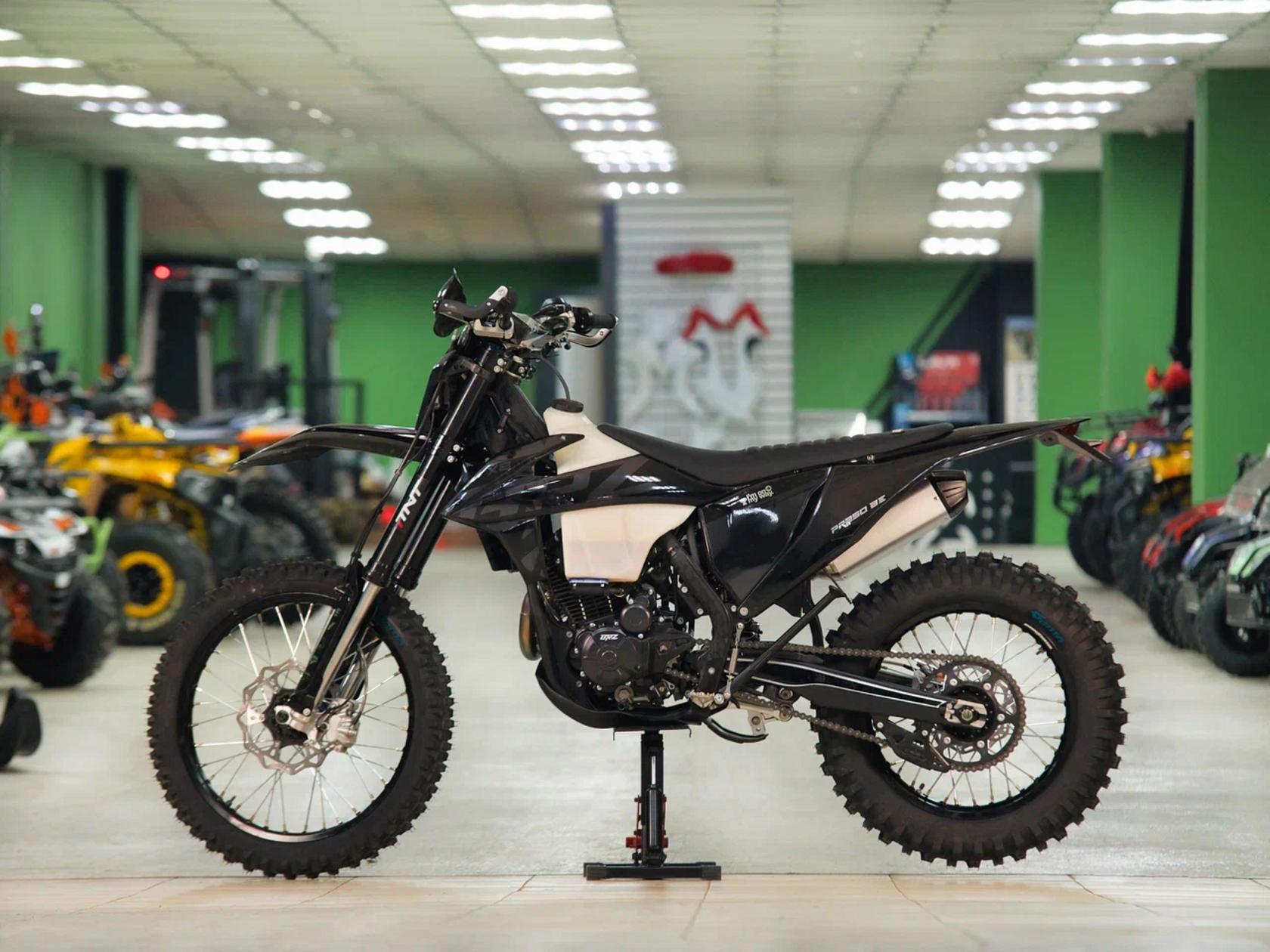 Комплектация Руль 28мм. Короткоходная ручка газа. Цепь 520. Алюминиевая литая лапка КПП, боковые накладки на рамы. Счетчик моточасов, приборная панель. Стоп сигнал, Грипсы Lock on, Защита рук Алюминиевая с пластиковыми щитками, Пластиковая защита радиатора.