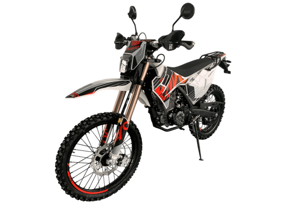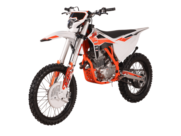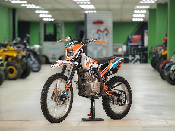 Мотоцикл KAYO K1-L 250 MX – “народная” версия внедорожного мотоцикла от компании KAYO 2024 модельного года. В его основе лежит проверенный временем двигатель, который обеспечил модели мировую популярность. Идеальный снаряд для внедорожного экстрима, представляющий собой оптимальный баланс производительности и технической оснащённости. Удобный, простой и надёжный мотоцикл, который полностью оправдывает свою цену.Мотоцикл оснащён одноцилиндровым 4-тактным двигателем воздушного охлаждения YX166FMM объёмом 223 см3, который выдаёт 17 л.с., что позволяет развивать большую скорость и с лёгкостью преодолевать трассы со сложным рельефом. Карбюраторная система подачи топлива с карбюратором PZ27 обеспечивает бесперебойную работу техники в самых жёстких условиях эксплуатации, простоту и лёгкость в обслуживании, а также неприхотливость к качеству топлива. Аппарат оснащён 5-ступенчатой механической коробкой передач с классической схемой “1-N-2-3-4-5”.Компания KAYO самостоятельно разработала раму и пластик на данном мотоцикле.Передняя подвеска – телескопическая регулируемая вилка перевёрнутого типа длиной 800 мм, задняя — нерегулируемый моноамортизатор длиной 360 мм, рассчитанный на высокие нагрузки до 900 LBS. Мотоцикл оснащён классическими спицованными колёсами диаметром 18 и 21 дюйм с прочными стальными ободами. Эффективное и безопасное замедление с любых скоростей обеспечивают гидравлические дисковые тормоза.Мотоцикл достаточно компактен и имеет вес всего 105 кг, поэтому он комфортен в эксплуатации одновременно и для мужчин среднего телосложения, и для девушек. Объём топливного бака составляет 6,7 л. Аппарат оснащён системой запуска двигателя при помощи кнопки электростартера или при помощи рычага кик-стартера.Высококачественная износостойкая резина с развитым протектором отлично держит дорогу на различных типах покрытия и в самых разных поворотах. Сиденье эргономичной формы покрыто антискользящим материалом. Яркая линзованная светодиодная фара позволяет кататься в тёмное время суток.K1 250 MX сочетает в себе отличные технические характеристики, комфорт и надёжность, что позволяет вам ощутить настоящую свободу на любой трассе.