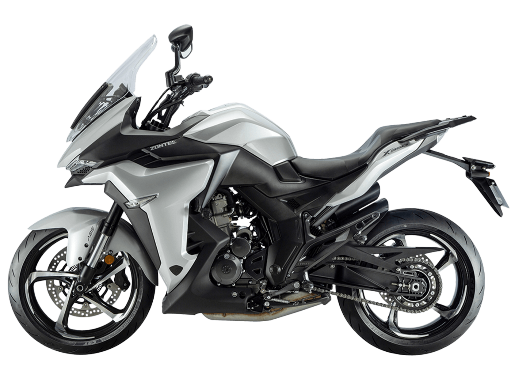 Мотоцикл ZONTES ZT350-X – турист со стремительным современным дизайном. Хорошо подходит как для повседневных поездок по городу, так и для покорения дальних маршрутов.Силовая установка представлена одноцилиндровым 4-тактным двигателем ZT184MP с 4 клапанами и 2 верхними распредвалами. Двигатель имеет объём 348 см³ и обеспечивает мощность в 39 л.с. Оснащён инжектором BOSCH и системой жидкостного охлаждения. Механическая коробка передач имеет 6 ступеней и схему 1-N-2-3-4-5-6. Запуск двигателя осуществляется с помощью бесключевого доступа.Ёмкость топливного бака 19 литров.Колёса представлены литыми алюминиевыми дисками диаметром 17 дюймов. На мотоцикл установлены датчики давления в шинах, показатели от которых выводятся на приборную панель. Для подвески спереди используется телескопическая вилка, сзади – моноамортизатор. Гидравлические дисковые тормоза произведены испанской компанией J.JUAN, входящей в холдинг BREMBO.Для освещения используется яркая LED-оптика, а приборная панель представлена цифровым дисплеем. Имеется 2 USB-порта.Габариты мотоцикла 2055х795х1330 мм. Колёсная база 1380 мм. Высота по седлу 795 мм. Вес 169 кг.