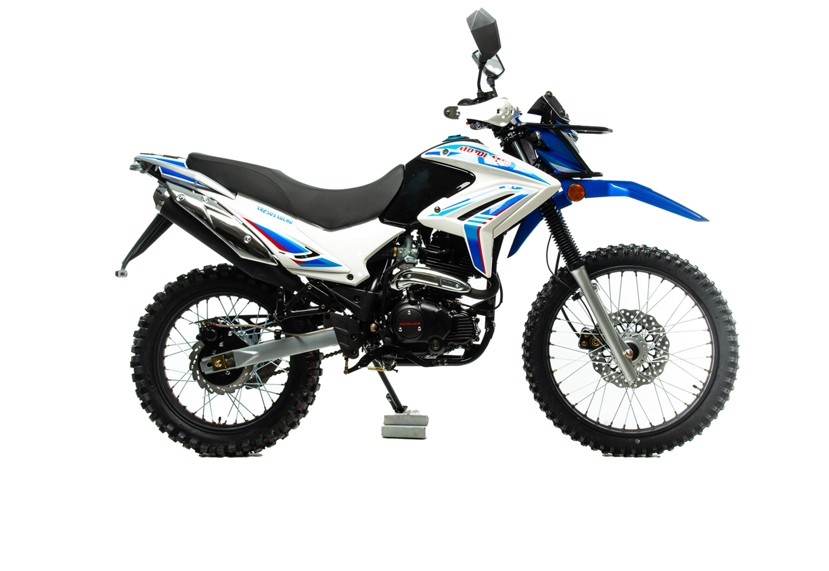 Обновленный мотоцикл Motoland XR250 ENDURO 165 предназначен для езды по бездорожью, эндуро соревнований, подходит для города, шоссейных и сельских дорог.Motoland XR250 ENDURO 165 отличаются высокой проходимостью, отлично ведут себя на мягком грунте и песке, легко преодолевают препятствия. Спортивный характер XR250 ENDURO подчёркивается современным дизайном. Классическая конструкция акцентирует внимание на сильных сторонах мотоцикла, которому не страшны грязь, брёвна, камни и другие преграды. Мотолэнд XR250 ENDURO весит 130 кг и подходит для пользователей любого роста, хорошо держит баланс и позволяет уверенно сохранять равновесие даже на сложных участках эндуро трасс. Колёса спицованные, сделаны из алюминия. Размер переднего колеса — 21 дюйм (530 мм), заднего — 18 дюймов (450 мм). Передние и задние тормоза дисковые. Покрышки с крупными шипами подходят для бездорожья, лесных дорог, песка и мягкого грунта. При этом купить мотоцикл Эндуро можно не только для соревнований, но и для езды по трассе и городу. Передняя вилка — классического типа. Задняя подвеска с моноамортизатором. Руль Эндуро усилен пластиковыми рамками, которые защищают руки гонщика от веток и травм при падениях. Приборная панель оснащена ЖК-экраном, на котором отображается вся информация о состоянии Эндуро: обороты, пробег, скорость и другие необходимые данные. Китайский Эндуро компании MotoLand оснащён одноцилиндровым 4-тактным двигателем 165 FMM с воздушным охлаждением. Мотор мощностью 16,3 л. с. и объёмом 250 см³ даёт возможность разгоняться на Эндуро по ровной трассе до 120 км/ч. Расход топлива — 5 литров на 100 км. Коробка передач механическая, 5-скоростная. Для запуска мотора используйте электростартёр или кикстартёр. Установлена электронная система зажигания (CDI). У нас Вы можете купить этот мотоцикл с бесплатной доставкой по РФ и гарантией до года. Также его можно приобрести в рассрочку или в кредит.