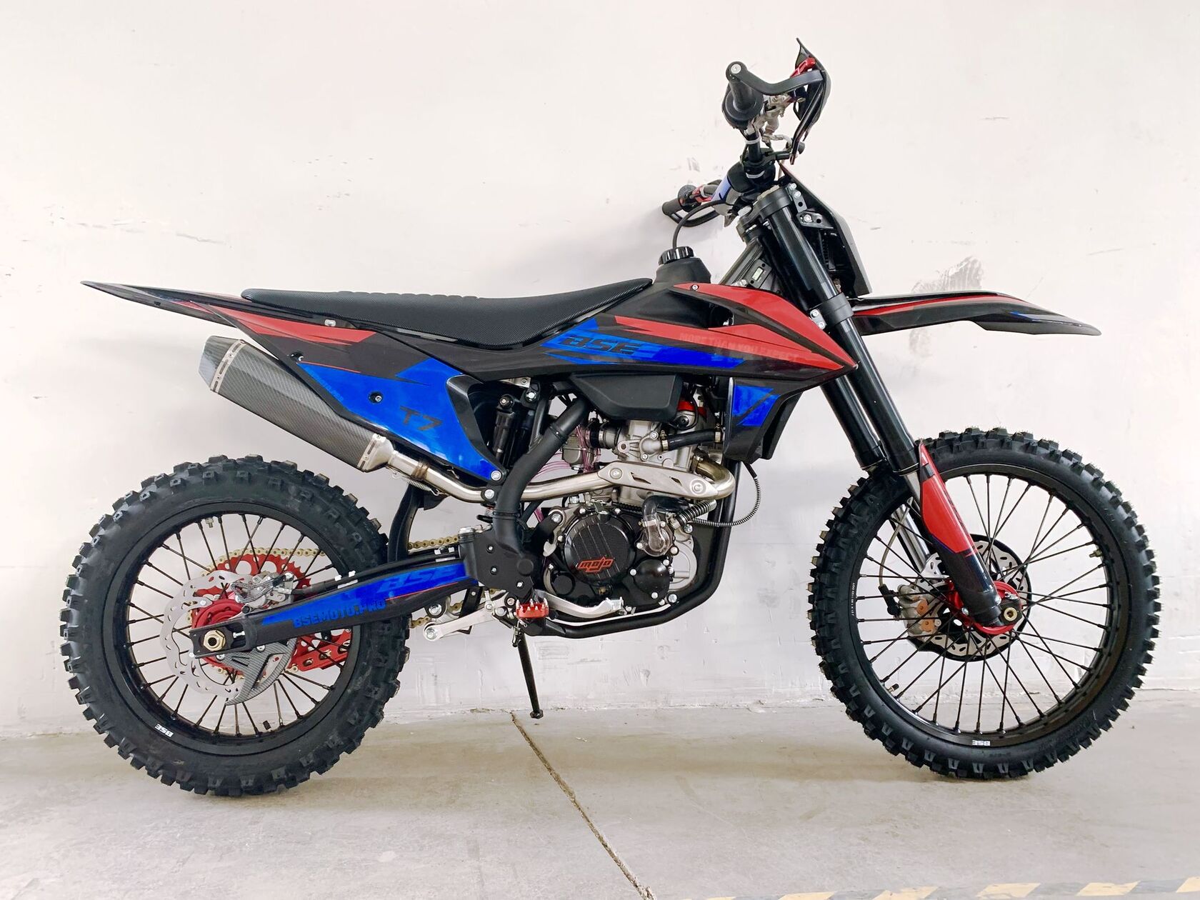1BSE RUSSIA рада представить модель Т7 в новой комплектации SPORT.T7 Sport укомплектован профессиональной подвеской Mojo Racing (от компании ZL Sport). Передняя двухкамерная вилка с закрытым картриджем имеет полный диапазон регулировок, диаметр перьев - 48 мм, длина вилки – 930 мм, ход - 280 мм. Сзади установлен полностью настраиваемый моноамортизатор BSE Mojo Racing длиной 480 мм и ходом 120 мм. Подвеска с большими ходами помогает отрабатывать даже самые жесткие приземления, с лёгкостью "глотая" все неровности. Подвеску легко настроить под любой рельеф, любую трассу и стиль езды. Вы ощутите результат, когда будете сокращать секунды круг за кругом! Разработка подвески Mojo Racing производилась опытными инженерами-подвесочниками завода, а настройка — под чутким контролем заводской спортивной китайской командой BOSUER. Особое внимание было направлено на снижение веса всей подвески. Установлены новые усиленные CNC траверсы вилки.Также комплектация Sport включает в себя обновленную переднюю тормозную гидравлическую систему с диском диаметром 240 мм и новым фрезерованным передним суппортом Mojo Racing, для более мощного и прогнозируемого торможения. Также усиленное сцепление, фрезерованные траверсы вилки, фрезерованные подножки с увеличенным зацепом и более легкую фрезерованную заднюю звезду.Двигатель T7 – мощный, технологичный и тяговитый 4-х тактный Zonsen ZS174MN-5A (NB300). Рабочий объём 300сс, 4-клапанная ГБЦ, водяное охлаждение. Минимальные вибрации благодаря наличию балансирного вала. Система питания – проверенный карбюратор Nibbi Racing PWK34. Все это позволило снять внушительные 30 л.с. при 8500 об. в мин. и 22 Нм при 7500 об. в мин. Коробка передач – механическая 6 ступенчатая, запуск – только электростартером. Мотор очень эластичный, с отличными показателями крутящего момента на низах и верхах. А легендарная надежность завода моторов ZONSEN, удобство в обслуживании и доступность запчастей в представлении не нуждается!Ещё одна особенность модели Т7 – стальная рама, которая полностью соответствует всем стандартам самого известного австрийского бренда мотоциклов для кросса и эндуро – KTM. Единая геометрия, эргономика, пропорции и углы вылета вилки. Высококачественная сталь, малый вес и большой запас прочности, идеальная развесовка. Мотоцикл оснащен легким алюминиевым подрамником, системой прогрессии и пластиковой защитой мотора. Установлен новый тип пластика, прочный, легкий и современный.На T7 установлен топливный бак на 8 л, мощная тормозная гидравлическая система с дисками диаметром 240 мм, звезды 13t – 49t, «зубастые» покрышки CHAOYANG MX880 ST. Мотоцикл оснащается полностью светодиодной фарой головного света, грипсами и ручкой газа Nibbi Racing, металлической защита рук, CNC подножками с увеличенным зацепом, цепкой шкуркой сиденья и защитой тормозных дисков под карбон.Легкий, прекрасно сбалансированный, мощный мотор. Отточенная управляемость. Подходит для новичков, а также спортсменов в дисциплинах эндуро, хард-эндуро, супер-эндуро, мотокросс.