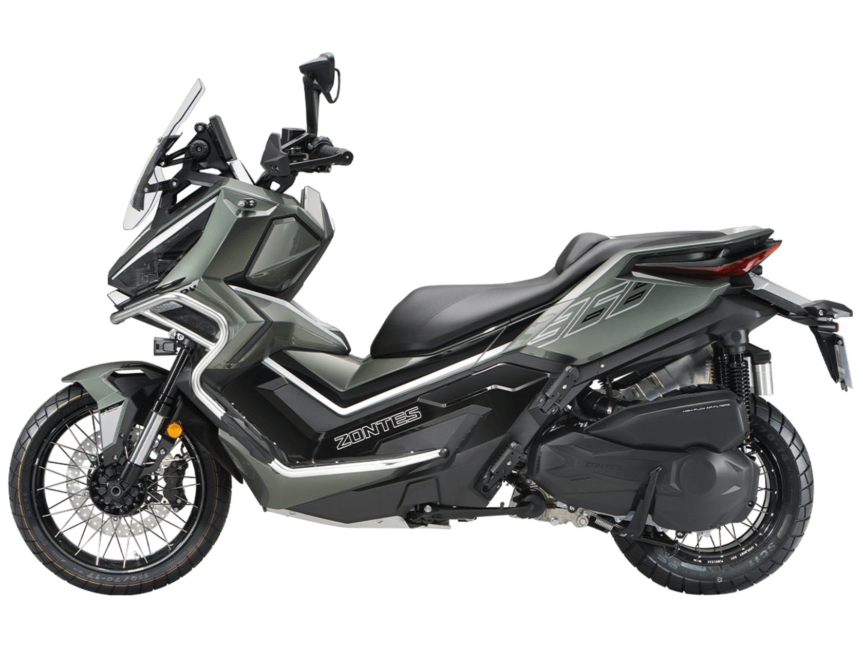 Скутер ZONTES ZT368-G – максискутер двойного назначения, готовый пронестись по улицам города за его пределы и отправиться по грунтовым тропам прокладывать свой маршрут туда, куда вам потребуется. Регулируемая подвеска с перевёрнутой телескопической вилкой спереди обеспечит отличную управляемость и устойчивость в любых условиях.Силовая установка представлена одноцилиндровым 4-тактным двигателем. Двигатель имеет объём 368 см³ и обеспечивает мощность в 38,8 л.с. Оснащён инжектором BOSCH, системой жидкостного охлаждения и вариатором. Запуск двигателя осуществляется с помощью бесключевого доступа.Ёмкость топливного бака 17,5 литра.Колёса имеют диаметр 17 дюймов спереди и 14 дюймов сзади. Для подвески спереди используется телескопическая вилка перевёрнутого типа, а сзади установлены 2 гидравлических амортизатора. Гидравлические дисковые тормоза произведены компанией J.JUAN, входящей в холдинг BREMBO. Мотоцикл также оснащён 2-канальной ABS-системой, противобуксовочной системой TCS System и датчиками давления в шинах.ZT350-G оборудован яркой LED-фарой, мультимедийной приборной панелью с TFT-дисплеем, имеются 2 USB-порта.Габариты скутера 2230х925х1290 мм. Колёсная база 1560 мм. Высота по седлу 795 мм. Вес 198 кг.
