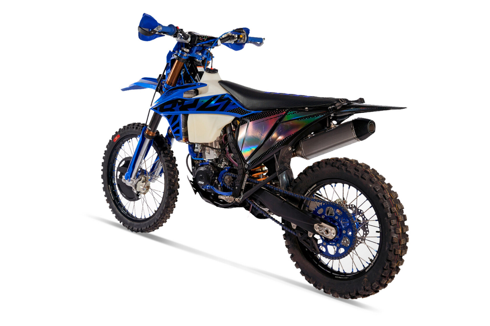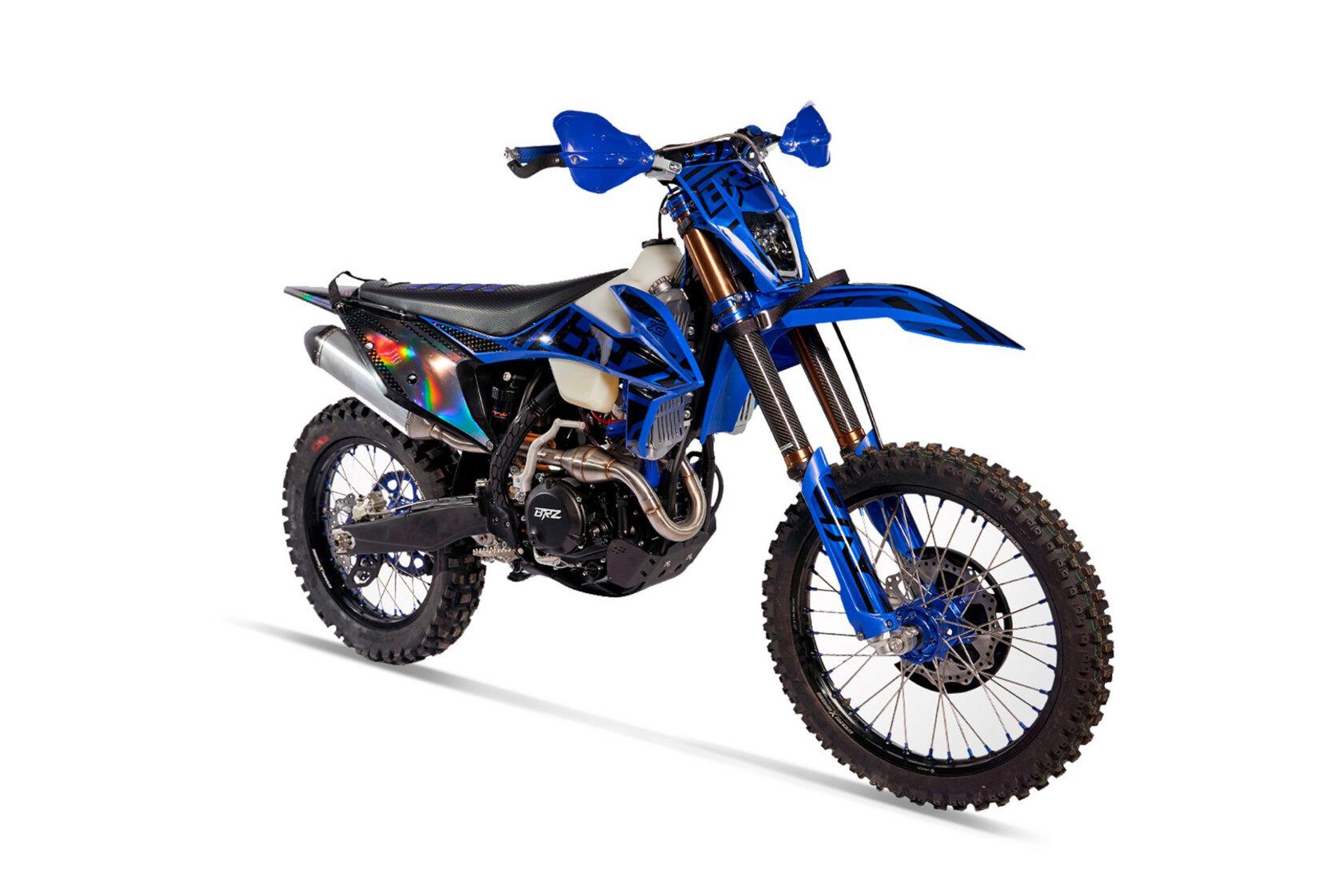 Мотоцикл BRZ X6 идеально себя чувствует в эндуро и кантри кросс дисциплинах. Идеально зайдет после владения «воздушкой». Сочные низа дают уверенность при преодолении сложных препятствий и подъемов с переставками. С газа поднимает на заднее колесо на любой передаче!За основу мотоцикла взят двигатель NC300 (ZS177FMM).В паре с двигателем установлен карбюратор NIBBI PWK 34 Black, надежный и неприхотливый в эксплуатации.Выхлопная системаДля реализации всего потенциала двигателя на BRZ X6 применена тюнингованная выхлопная система. Изменили приемную трубу.Чтобы передавать всю мощность двигателя на трансмиссию была доработана система сцепления. Установлены усиленные японские диски (железные и фрикционные) от японского бренда F.C.C. Также применена крышка сцепления со встроенной дополнительной форсункой, через которую подается масло и дополнительно охлаждает и смазывает пакет дисков. Эта система продляет срок службы сцепления, дает возможность преодолевать сложные препятствия, где нужно «травить» сцеплением. Для облегчения выжима применены специальные тросы с уменьшенным трением за счет специальной полиуретановой оболочки стального троса, а также специальный переходной кронштейн легкого выжима.Радиаторы системы охлаждения надежно защищены алюминиевой рамкой с распорными втулками. На правом радиаторе в базе установлен вентилятор, также упакованный в алюминиевую защиту, чтобы в критический момент он не вышел из строя. Резиновые шланги были заменены на силиконовые, они лучше справляются с температурой и не высыхают со временем.Все полноразмерные модели BRZ построены на новой раме K8. Она сделана по подобию рамы KTM 2017-2022 года. Благодаря стальной легкой раме мотоцикл получил правильную развесовку, он лучше рулится в поворотах и более стабилен на больших скоростях. С передней части рамы установлена алюминиевая защита двигателя.Подрамник выполнен из алюминия. Легкий и прочный, в отличии от пластикового, выдерживает падения или нежелательного сальто, его можно выправить в случае деформации.В паре с новой рамой используется новый маятник. Он производится по гравитационной технологии литья, что дает высокую жесткость на скручивание. С завода маятник одет в пластиковую защиту. Она возьмет на себя все царапины и удары. Если захотите вернуть свой мотоцикл к заводскому внешнему виду – просто обновите защиты.На BRZ X6 применяются усиленные ступицы, которые сделаны из единого куска алюминия, обработанного на ЧПУ станке (CNC). 4мм усиленные спицы, алюминиевые обода «Enduro X series» из авиационного алюминия 7075.Покрышки на мотоцикле бренда «GEMA». Задняя покрышка шириной 140мм Super Soft. Теперь не нужно менять покрышки на новом мотоцикле!BRZ X6 получил подвеску MNT. Передняя вилка с картриджем закрытого типа. Диаметр зеркала 48мм. Вилка полностью регулируемая на отбой и сжатие. Задний амортизатор MNT с выносным бачком также имеет регулировки скорости отбоя и сжатия, плюс к этому есть возможность регулировки медленного сжатия за счет дополнительного перепускного клапана. Подвеска успешно справляется с большими нагрузками на скоростных кроссовых треках с высокими прыжками. Также ее можно расслабить для эндуро.CNC траверсы выполнены из авиационного алюминия 7075. Выдерживают большие нагрузки, легкие и прочные.Тормоза полностью повторяют по конфигурации Brembo. Предсказуемо и н