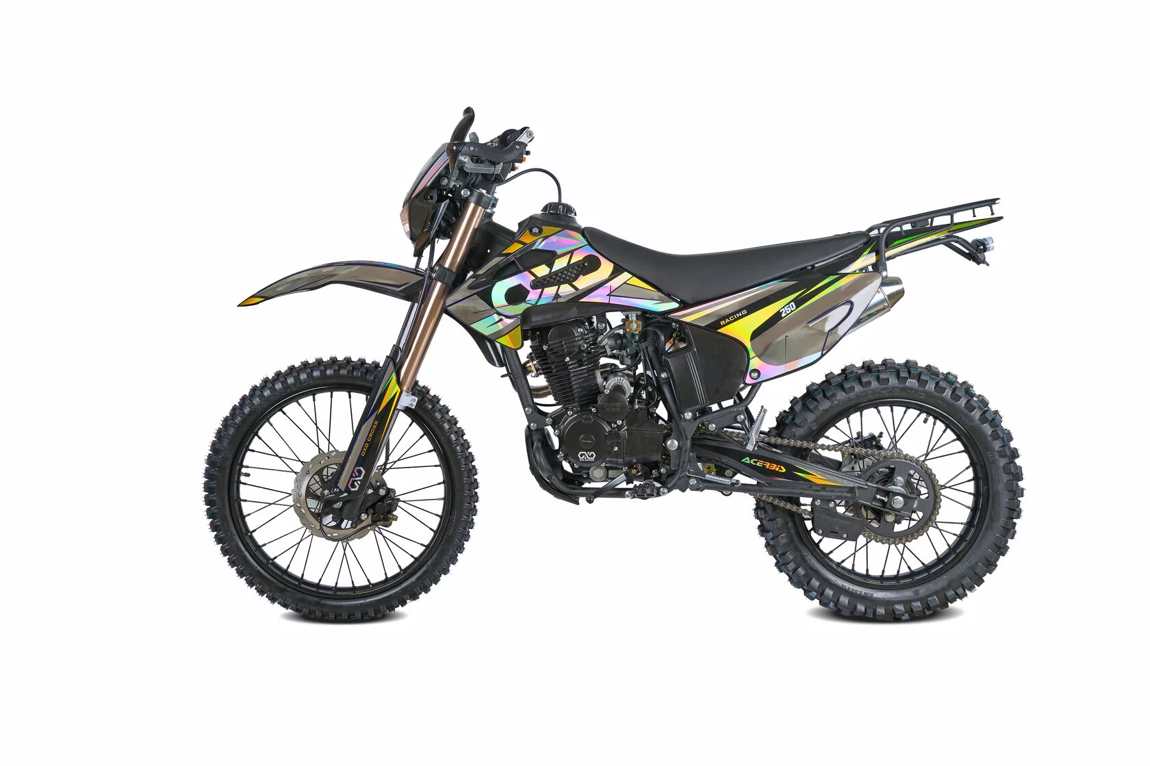ДвигательДвигатель ZS165FMM - 4-тактный двигатель воздушного охлаждения объёмом 223 куб см с двумя клапанами, оснащён балансировочным валом, благодаря которому уменьшается избыточная вибрация, передаваемая от двигателя на раму и общую конструкцию техники. Характеризуется хорошей тягой с самых низов и лёгким пуском с помощью электростартера. Двигатель отлично зарекомендовал себя в качестве надёжного, универсального, неприхотливого мотора с хорошими характеристиками.РамаРама мотоцикла OXO производится из труб шестигранного сечения хром-молибденовой стали, которая является очень прочной и легкой. Геометрия рамы, благодаря правильно выверенному центру тяжести и углу наклона вилки - способствует наилучшей управляемости устойчивости мотоцикла на низкой скорости.ПодвескаПередняя вилка перевернутого типа. Мотоцикл LITE 250 снабжен моноамортизатором, который соединен посредством системы рычагов прогрессии. Система прогрессии, обеспечивает равномерную, мягкую работу и увеличивает длину рабочего хода подвески.КолесаРазмер передней покрышки: 80/100-21. Размер задней покрышки: 120/100-18. Они прекрасно себя ведут по песку и грязи, что позволяет райдеру отлично показать себя на пересеченной местностиТормозная системаТормозная система мотоцикла - полностью гидравлическая с армированными шлангами. Спереди и сзади установлен двухпоршневой суппорт. Данная конфигурация тормозных механизмов, позволит быстро и безопасно остановиться с максимальной скорости даже на бездорожье.РульВажная часть современного эндуро мотоцикла - усиленный руль переменного сечения Мотоцикл укомплектован панелью приборов.