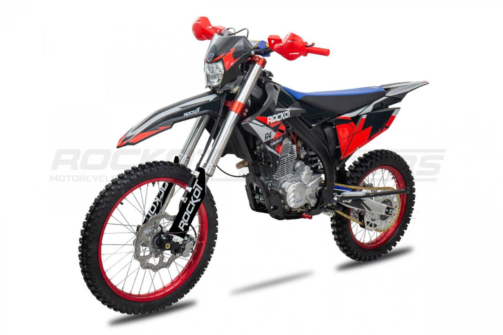Мотоцикл ROCKOT R4-250 - полноразмерный эндуро мотоцикл. Он специально создан для райдеров, которые уже выросли из питбайка и хотят раздвинуть свои пределы. Он подойдет и начинающим эндуристам с ростом от 170 см. ROCKOT R4-250 идеально себя чувствует в лесных прохватах с преодолением различных препятствий благодаря небольшому весу, тяговитому двигателю и большим колесам 21/18. Мотоцикл максимально упрощен для большей надежности. Из электрики он снабжен лишь светодиодной фарой электростартером Пу сути в нем просто нечему ломаться, можно смело ездить в лесные мото походы на 40 - 200 км. Инженеры Rockot учли все ошибки конкурентов и снабдили мотоцикл качественными подвесками и алюминиевыми ободами. Был переработан узел верхнего крепления двигателя к раме, избавивший от повышенных вибраций. Ведомую звезду закрепили на 6 потайных болтов. Ну и не стали экономить на карбюраторе - в базе установлен NIBBI PE 28. Подведя итог можно смело заявить что R4 - идеальный выбор для тех, кто хочет купить бюджетный эндуро мотоцикл!У нас Вы можете купить этот мотоцикл с бесплатной доставкой по РФ. Также его можно приобрести в рассрочку или в кредит.