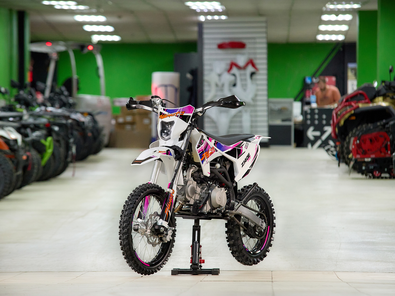 Один из самых быстрых и маневренных питбайков JHL Z140E Pro производится из качественных материалов, отличающихся прочностью и надежностью. Этот китайский кроссовый мотоцикл пользуется спросом у профессиональных мотогонщиков. Но также его за легкий вес и комфортное управление модель выбирают и любители. Основные особенности китайского кроссового питбайка Z140E ProМотоцикл спортивный JHL Z140E Pro обладает оптимальными техническими характеристиками, а также тщательно продуманным дизайном, делающим его использование удобным и сравнительно несложным. Его четырехтактный бензиновый двигатель способен быстро развивать скорость и двигаться по бездорожью до 85 км в час. Основными причинами, почему стоит купить питбайк именно этой модели, являются следующие:мощность в чуть больше одиннадцати конских сил - питбайк вытягивает там, где аналоги могут уже сдаться;прочная стальная рама, которая не боится бездорожья, падений и механических ударов;самая современная система торможения, за счет чего водитель более защищен от непредвиденных ситуаций;небольшой вес и размеры, что позволяет не только использовать его для езды, но и удобно транспортировать к месту мотогонок или буксировать при поломке, хотя китайский мотоцикл редко выходит из строя без серьезных причин;выгодная стоимость у нас, поэтому не нужно искать, где можно купить питбайк недорого.